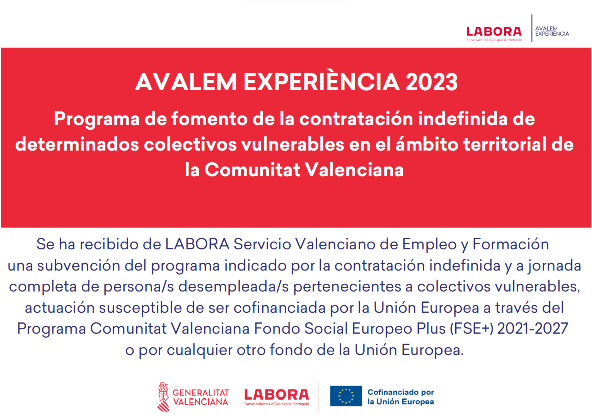 Sarch Composites S.L. ha sido beneficiaria de una subvención de LABORA Servicio Valenciano de Empleo y Formación en el marco del programa indicado por la contratación indefinida y a jornada completa de persona/s desempleada/s pertenecientes a colectivos vulnerables, actuación susceptible de ser cofinanciada por la Unión Europea a través del Programa Comunitat Valenciana Fondo Social Europeo Plus (FSE+) 2021-2027 o por cualquier otro fondo de la Unión Europea, con un importe de 27.216 €.